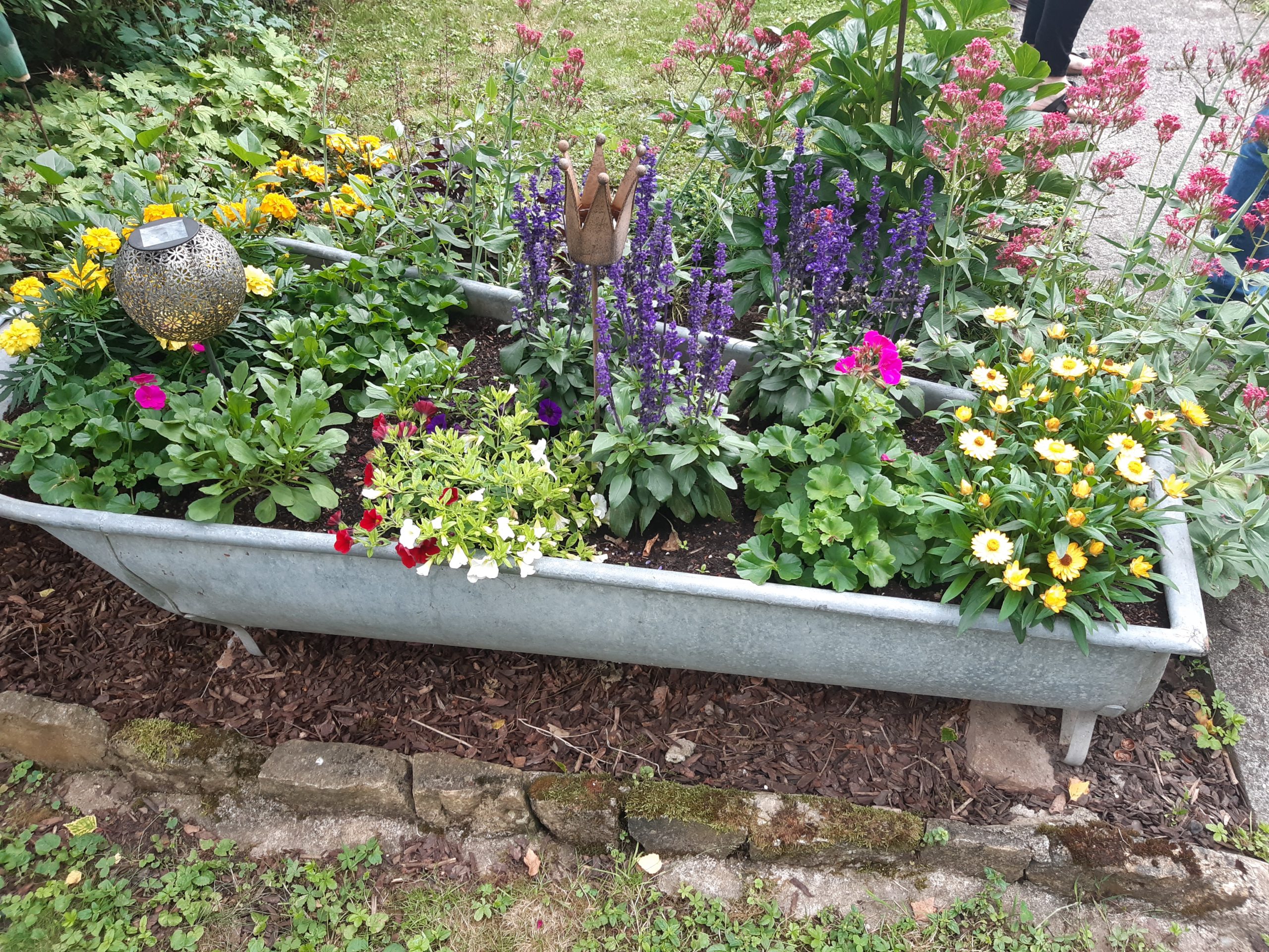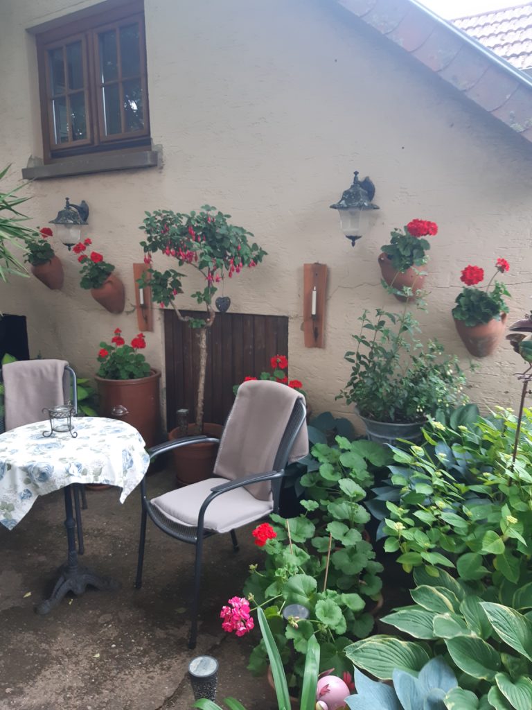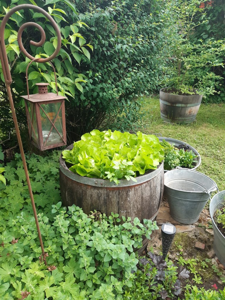 Nach dem Motto „von allem Ebbes“ gibt es in diesem liebevoll gestalteten Garten wirklich in jeder Ecke etwas Neues zu entdecken. Eine stilvolle Sammlung aus Kunst- und Flohmarktschätzen verleiht dem Garten einen einzigartigen Charme. Ob Blumen in der Badewanne oder Salat im alten Weinfass, hier wird einiges zum kreativen Pflanzgefäß umfunktioniert. Gleich mehrere romantische Sitzecken laden zum Verweilen ein, von denen man den Garten immer wieder auch bei schlechtem Wetter, aus einem neuen Blickwinkel genießen kann.