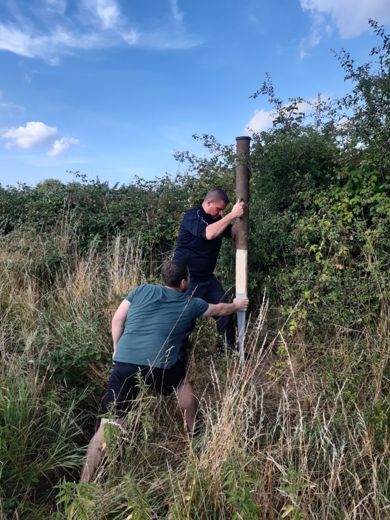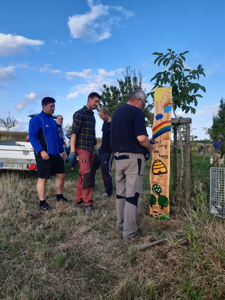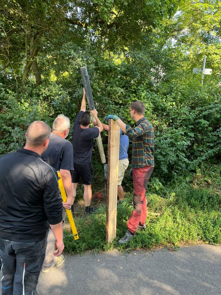 Mit dabei hatten wir neben unglaublich viel Manpower, massig an schwerem Gerät und diversen Hülsen und Pfosten natürlich all die wundervoll gestalteten Schwartenbretter der Storchenfamilien und weiteren Mitgliedern des Obst- und Gartenbauvereins.